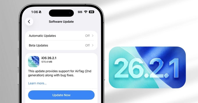 Apple đã chính thức phát hành iOS 26.2.1 vào ngày 26 tháng 1, hỗ trợ cho tất cả các iPhone tương thích với iOS 26. Bản cập nhật này được thiết kế chủ yếu để bổ sung khả năng hỗ trợ cho thiết bị theo dõi vật dụng thế hệ mới AirTag 2 với tính năng Tìm kiếm Chính xác được cải tiến. Ngoài ra, bản cập nhật cũng hứa hẹn khắc phục một số lỗi tồn tại từ các phiên bản trước.